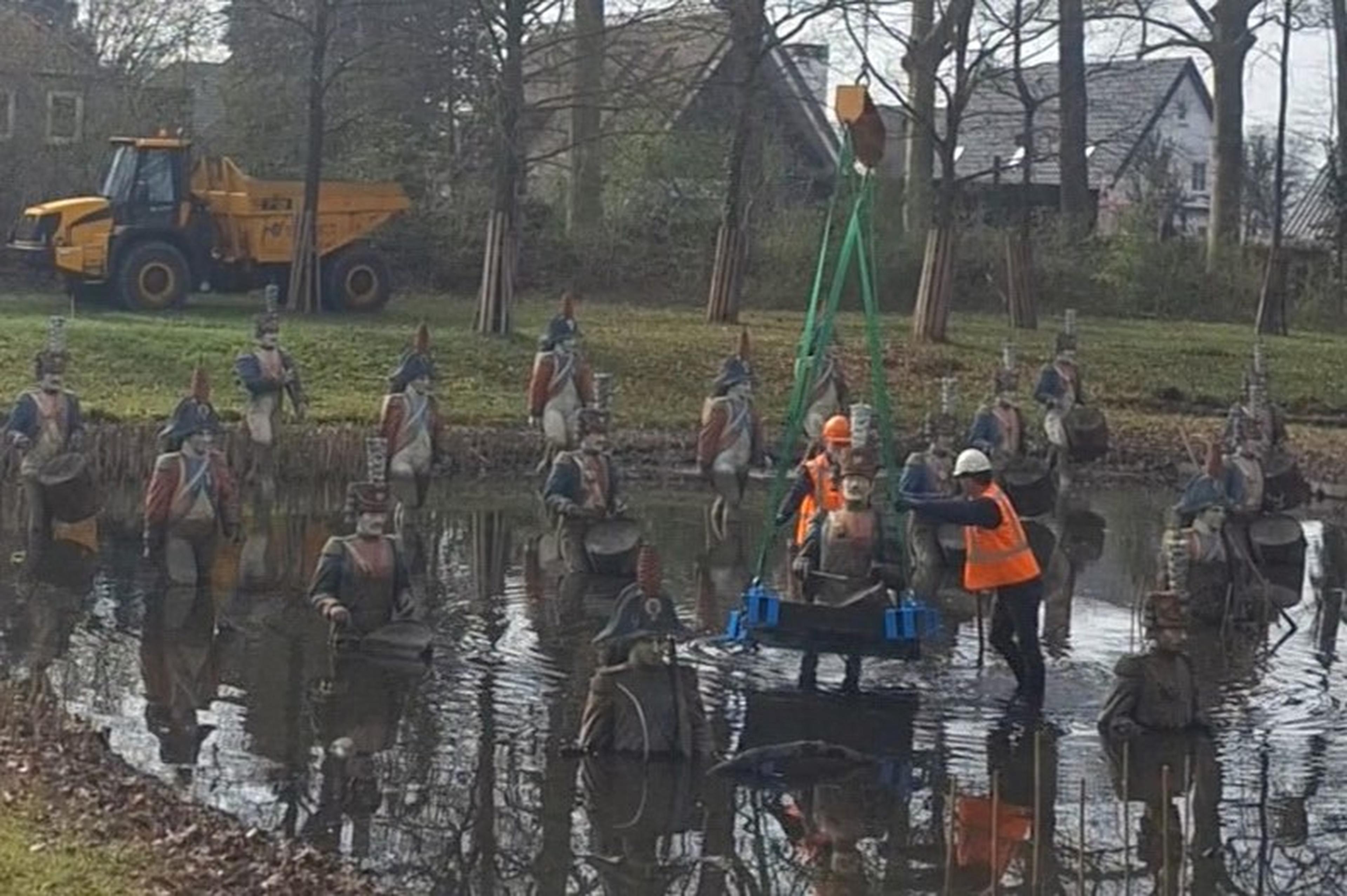 Met het verwijderen van tien van de 25 Napoleonbeelden uit de vijver van Landgoed Steenenburg in Nieuwkuijk is maandag 23 maart de renovatie van het kunstwerk ‘De Strijd bij Waterloo’ echt begonnen. Ook wordt komende maanden de omgeving van de vijver opgeknapt.